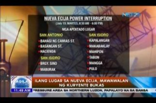 GAPAN, Nueva Ecija (Eagle News) — Pansamantalang mawawalan ng suplay ng kuryente sa sa ilang baranggay sa bayan ng San Antonio, San Isidro at Gapan sa Nueva Ecija bukas, Hulyo 19. Sa inilabas na advisory ng Nueva Ecija Electric Cooperative o NEECO 1, ang power interruption ay magsisimula ng 8:30 ng umaga hanggang alas 6:00 ng hapon. Ito ay para bigyang daan ang pagsasaayos ng mga poste at linya ng kuryente sa mga nasabing lugar.