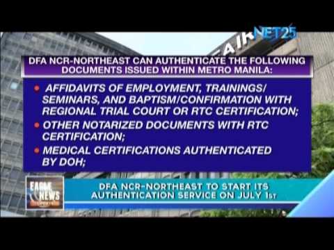 Public service announcement: The Department of Foreign Affairs satellite office in NCR-Northeast will provide authentication of documents issued in Metro Manila.
