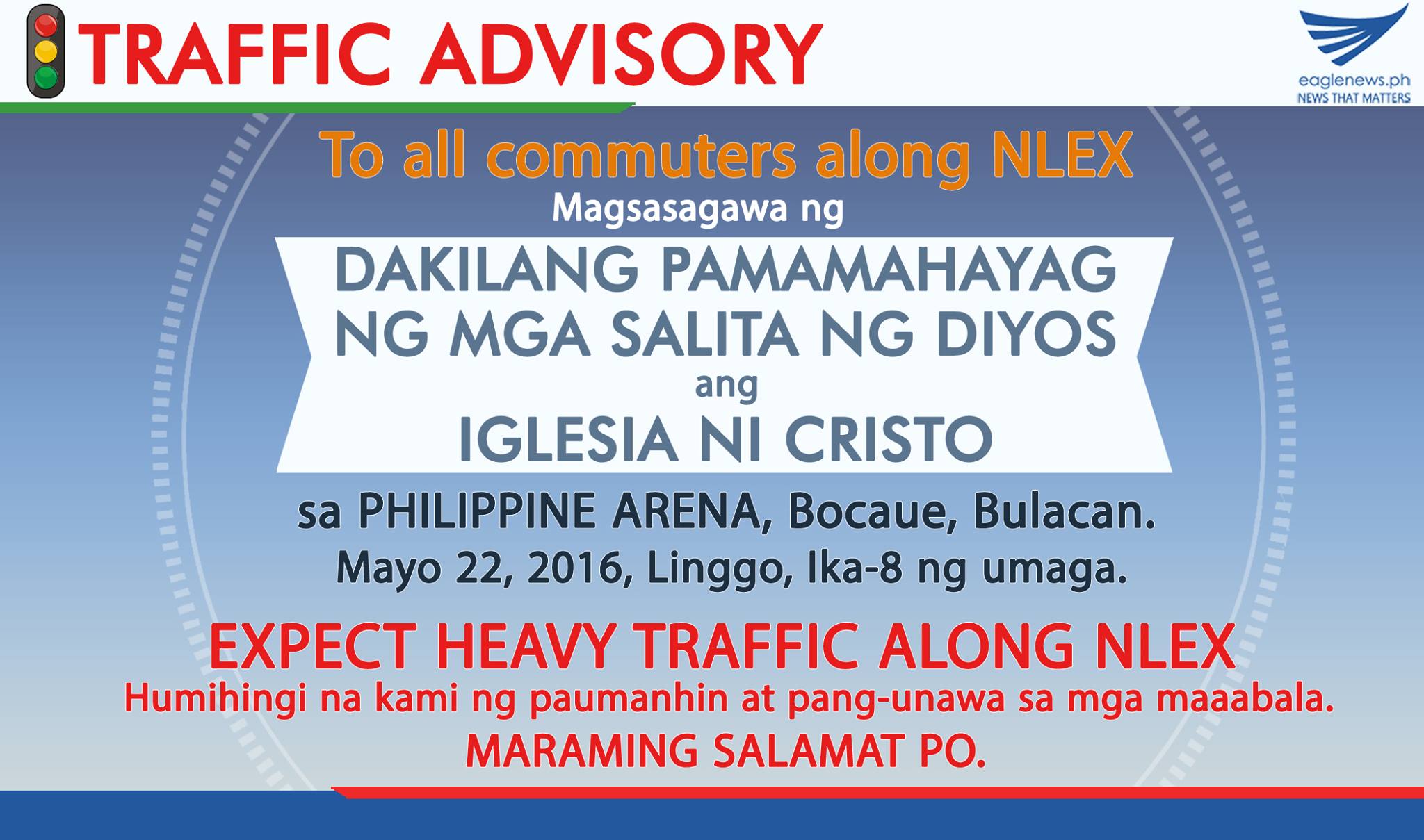 FYI motorists and commuters! Keep safe! Iglesia Ni Cristo to hold Worldwide Evangelical Mission at the Philippine Arena on Sunday, May 22.
