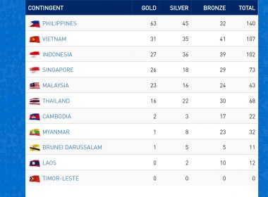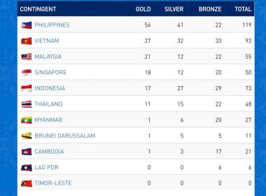 (Eagle News) – The Philippines continued to dominate the 30th Southeast Asian Games after Day 4, on Wednesday, Dec. 4, with 56 gold medals, 41 silver medals and 22 bronze medals. The Philippines now has a total medal haul of 119. It is followed by Vietnam with 27 golds, 32 silvers and 33 bronze medals; Malaysia with 21 golds, 12 silvers and 22 bronze medals; and Singapore with 18 golds, 12 silvers, and 20 […]