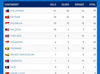 (Eagle News) — Host country, the Philippines, continued to dominate the 30th Southeast Asian Games as Filipino athletes won 41 gold medals, and a total medal haul of 79, as of 2 p.m. Tuesday, Dec. 3, 2019. Some of the games pushed through while outdoor events had to be rescheduled for another day as typhoon Kammuri (TisoyPH) battered the country with strong winds and heavy rains. As of the 2 p.m. medal tally, the […]
