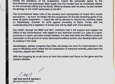 (Eagle News)–The University Athletic Association of the Philippines Inc. has lifted its suspension on University of the Philippines Fighting Maroons head coach Bo Perasol over his outburst in a game against Ateneo. In lifting the suspension on Perasol, the UAAP noted the “sincerity and voluntariness” of his “words and actions” when he personally spoke to the commissioner and “expressed deep regrets over the incident and its unintended effects” on the referee who was the subject […]