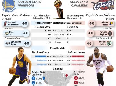 CLEVELAND, United States (AFP) — A game-by-game look at the Golden State Warriors’ 2017 NBA playoff win streak, which became the longest in North American pro sports playoff history on Wednesday: First Round April 16: Golden State 121 Portland 109 April 19: Golden State 110 Portland 81 April 22: Golden State 119 Portland 113 April 24: Golden State 128 Portland 103 Second Round May 2: Golden State 106 Utah 94 May 4: Golden State 115 […]
