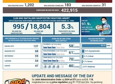 (Eagle News) — COVID-19 cases in the country breached the 422,000 mark on Wednesday, Nov. 25, after the Department of Health reported 1202 additional cases. The DOH said of the 422,915 total cases, 27745 were active. Of these, 83.7 percent were mild, 8.2 percent asymptomatic, 5.1 percent critical, 2.7 percent, and 0.27 percent moderate. The areas with the most COVID-19 cases reported today were Davao City with 137, Quezon City with 68, Batangas with 59, […]