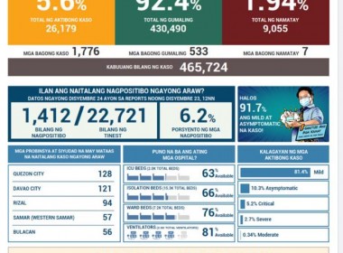 But 92.4 percent or 430,490 listed as having already recovered (Eagle New) – Total COVID cases in the country reached 465,724, but majority of these, at 92.4 percent have already recovered, according to the latest data from the Department of Health on Thursday, Dec. 24. The additional cases reported on Thursday reached 1,776, which is way above the previous day’s (Dec. 23) additional cases of only 1,196. The areas with the highest number of new cases […]
