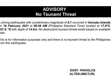 (Eagle News) — There is no tsunami threat to the Philippines. The Philippine Institute of Volcanology and Seismology issued the advisory following a strong earthquake that struck Vanuatu on Tuesday. The United States Geological Survey said the quake, which had a preliminary magnitude of 6.7, struck 59 kilometers west of Port Vila. According to PHIVOLCS, the earthquake hit at 8:49 a.m., Philippine time, and had a depth of 14 kilometers. Media reports said the quake […]