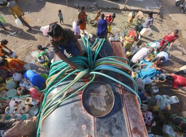 Indian slum dwellers collect potable water from a municipal water tanker in Durga Nagar area of Bhopal on March 21, 2018. Slum dwellers depend on government supplies for drinking water and struggle to get adequate supply during summer. /Files/ AFP /