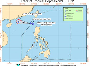 (Eagle News) — “Helen” is now outside the Philippine Area of Responsibility. The Philippine Atmospheric Geophysical and Astronomical Services Administration said “Helen,” which has slightly intensified, exited the northern boundary of PAR at 1 a.m. It is estimated 395 kilometers west of Basco, Batanes, with its center packing maximum winds of 55 kph near the center and gustiness of up to 70 kph. It is moving west northwestward at 15 kph towards the South China […]