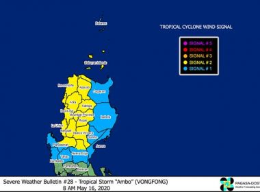 (Eagle News)–Tropical Storm “Ambo” remains almost stationary over the Luzon Strait and is forecast to weaken into a low pressure area in the next 12 to 24 hours. The Philippine Atmospheric Geophysical and Astronomical Services Administration said Signal No. 1 is hoisted over Batanes and Babuyan Islands with the center of “Ambo” estimated 125 km west northwest of Calayan, Cagayan. It is packing maximum winds of up to 45 kph near the center and gustiness […]