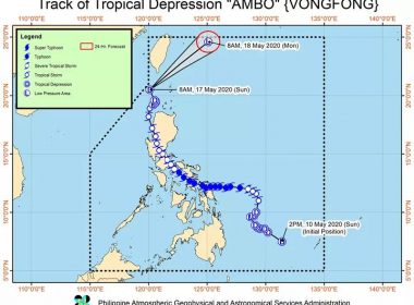 (Eagle News)–Signal No. 1 remains hoisted over four areas as “Ambo,” now a tropical depression, slowed down. In its 11 p.m. advisory, the Philippine Atmospheric Geophysical and Astronomical Services Administration said the extreme northern portion of Ilocos Norte (Burgos, Bangui, Pagudpud), the extreme northwestern portion of mainland Cagayan (Santa Praxedes, Claveria), Babuyan Islands, and Batanes are under the tropical cyclone wind signal with Ambo’s eye 95 kilometers west of Calayan, Cagayan. “Ambo” is packing winds […]