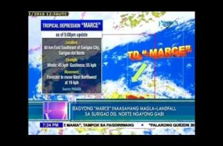 Inaasahang magla-landfall ang bagyong “Marce” sa Surigao Del Norte ngayong gabi. Ayon sa PAGASA, mahina lamang ang hanging dala ng bagyo ngunit mararanasan ang malakas na ulan sa mga lugar na daraanan ng bagyon. As of 4pm, huling namataan ng PAGASA ang sentro ng bagyong marce sa layong animnapung kilometro silangan timog-silangan ng Surigao City, Surigao Del Norte. Napanatili nito ang lakas ng hanging aabot sa apatnaput limang kilometro kada oras malapit sa gitna at […]