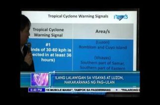 Patuloy na binabantayan ng PAGASA ang bagyong Marce at inaasahan na muling magla-landfall sa Calamian Group of Islands ngayong gabi. Ito na ang ika-limang beses na pag-landfall ng nasabing bagyo. As of 4pm huling namataan ng PAGASA ang bagyong Marce sa layong limamput limang kilometro timog-silangan ng Coron,Palawan. Taglay nito ang lakas ng hanging aabot sa 65 kilometro kada oras malapit sa gitna at pabugsong aabot sa 100km kada oras. Nakataas ang signal number 2 […]