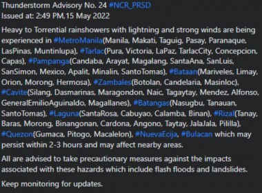 PAGASA forecasts isolated rains, thunderstorms until 5 p.m. of Monday, May 16 (Eagle News) – Heavy torrential rains with lightning and strong winds were experienced Sunday afternoon, May 15, in Metro Manila and other areas in Central Luzon and CALABARZON region, the country’s weather bureau said. PAGASA said that these sudden heavy rains were due to thunderstorms. In a thunderstorm advisory issued at 2:49 p.m. on May 15, it identified these areas that experienced heavy […]