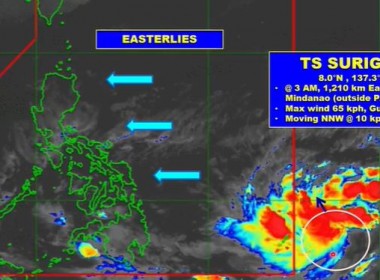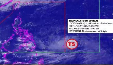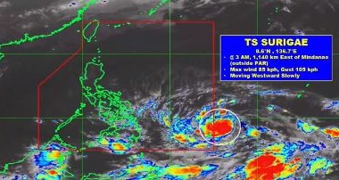 (Eagle News) — The tropical depression monitored outside the Philippine Area of Responsibility has intensified into a tropical storm. Philippine Atmospheric Geophysical and Astronomical Services Administration weather forecaster Benison Estareja said TS “Surigae,” which was so far situated 1210 kilometers east of Mindanao, may further intensify into a typhoon and may enter PAR on Friday. So far, it is packing maximum sustained winds of 65 kilometers per hour near the center, with gustiness of up […]