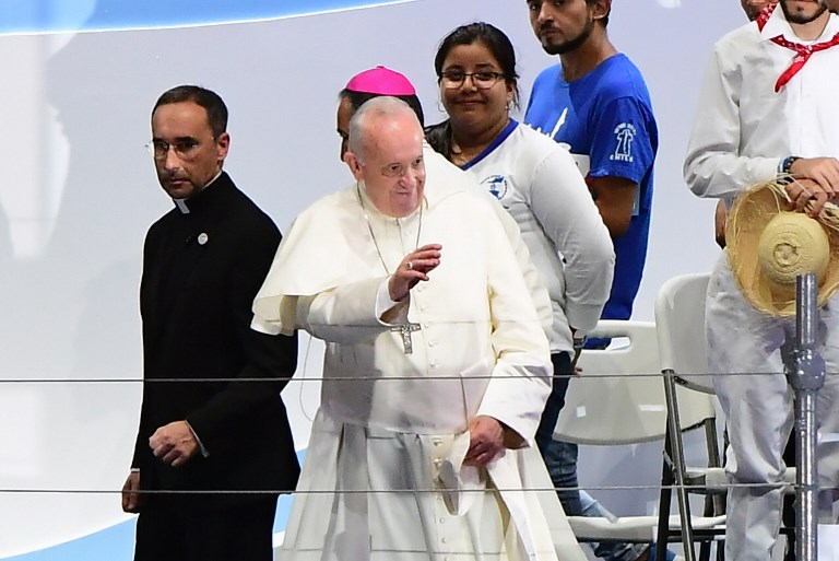 Catholic Church’s Pope Francis (C) waves at the end of the Via Crucis ceremony on the main highway running along Panama City’s Pacific shoreline, on January 25, 2019. – The World Youth Day celebrations have drawn around 200,000 young people from around the world to Panama, where Pope Francis is expected to defend Central American migrants and human rights. (Photo by Luis Acosta / AFP)
