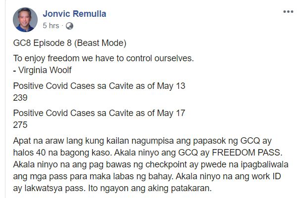 “Marami sa inyo ang magagalit sa akin. Mas mabuti na galit kayo sa akin at Wala kayong Covid kaysa natutuwa kayo sa akin at nadadagdagan ang may sakit…Tandaan, Ang Q sa GCQ ay “Quarantine.” Hinde pa po tapos ang sakuna,” he added.