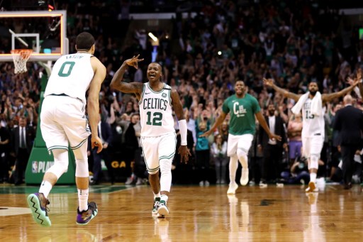 Terry Rozier (#12) of the Boston Celtics celebrates with Jayson Tatum (#0) after hitting a three-point shot to end the first half against the Philadelphia 76ers on May 9, 2018, in Boston, Massachusetts. Maddie Meyer/Getty Images/AFPJayson Tatum