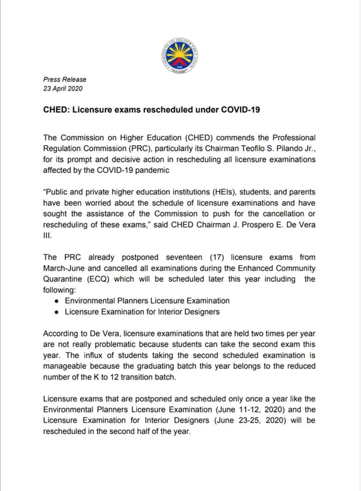 He said the Environmental Planners Licensure Examination initially sent on June 11-12 and Licensure Examination for Interior Designers on June 23-25 will be scheduled later this year.