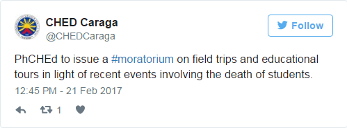 “I will be asking the Commission en banc to immediately issue a directive to all higher education institutions so we can properly investigate this tragedy and review current policies covering field trips,” Commissioner Prospero De Vera announced earlier.