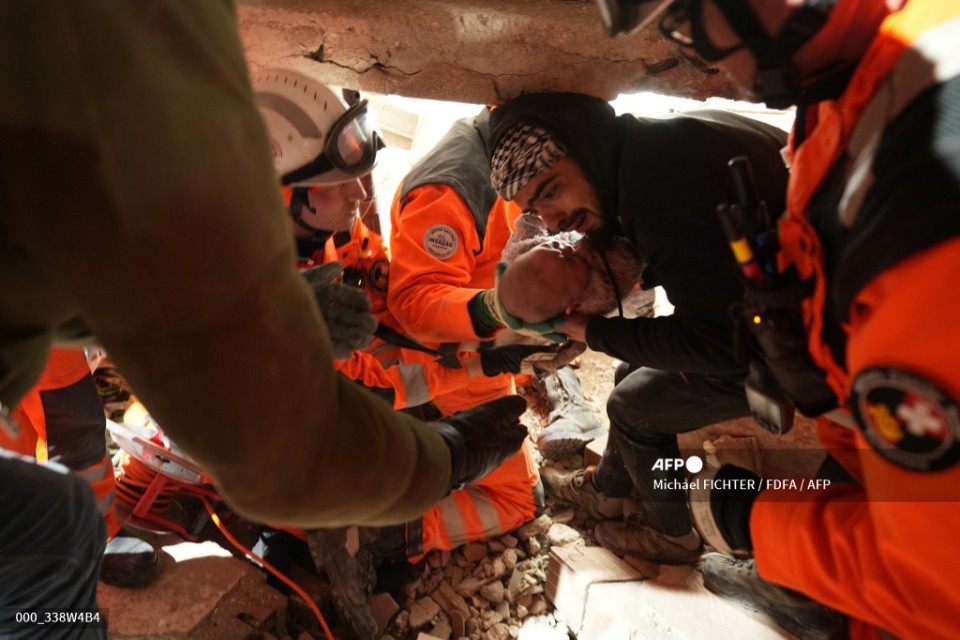 This handout photograph made available by the FDFA’s Swiss Agency for Development and Cooperation (SDC) on February 9, 2023, shows members of the Swiss rescue team handing over a four-month-old girl called Abir rescued from under the rubble of a collapsed building following a massive earthquake on February 6, in Antakya, in Hatay province on February 8, 2023. – The four-month-old Abir survived with her relatives for almost three days in the rubble of a residential building and was rescued by the Swiss team, after which she was handed over to a relatives. The FDFA confirmed that this marks the first time in 20 years that Swiss rescue workers sent to assist with catastrophe’s abroad have found people alive. (Photo by Michael FICHTER / FDFA / AFP)