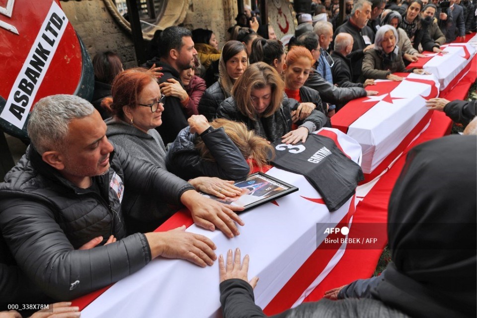 Mourners attend the funeral of seven Cypriot students killed in a powerful earthquake that hit Turkey, on February 10, 2023 in Famagusta, in the breakaway Turkish Cypriot statelet of northern Cyprus. – Two dozen children aged 11 to 14 from the island, along with 10 parents, four teachers and a volleyball coach, were in the southern Turkish city of Adiyaman when the quake hit. The 7.8-magnitude tremor, whose epicentre was near Gaziantep, about 130 kilometres (80 miles) southwest of Adiyaman, has claimed the lives of more than 21,000 people in Turkey and Syria. (Photo by Birol BEBEK / AFP)