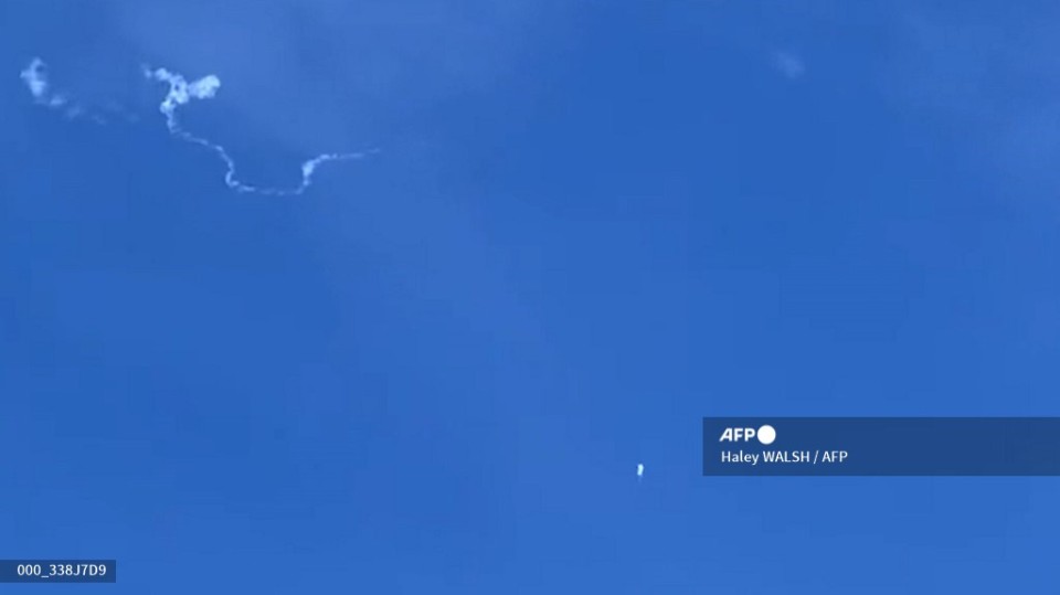 This still image taken from a cellphone video by Haley Walsh in Myrtle Beach, South Carolina, shows a suspected Chinese surveillance balloon after it was shot down on February 4, 2023. – A US fighter jet on Saturday shot down the Chinese balloon off the coast of South Carolina, the Pentagon said, over what it called Beijing’s “unacceptable violation” of US sovereignty. (Photo by Haley WALSH / AFP)