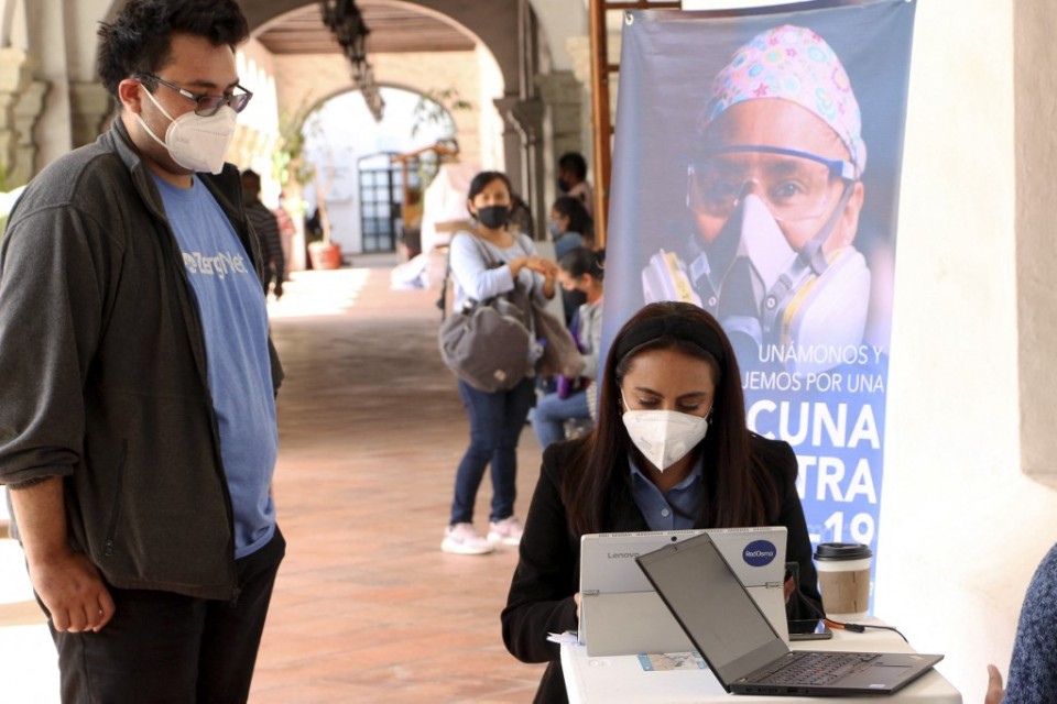 A worker is seen at the information and recruitment modules for the application of the candidate phase III vaccines against COVID-19 of the Chinese pharmaceutical company CanSino Biologics against COVID-19 at town hall, in Oaxaca de Juarez, Mexico, on November 5, 2020. – Mexico participates in the first clinical trial in Latin America with the application of more than 10,000 doses. (Photo by PATRICIA CASTELLANOS / AFP)