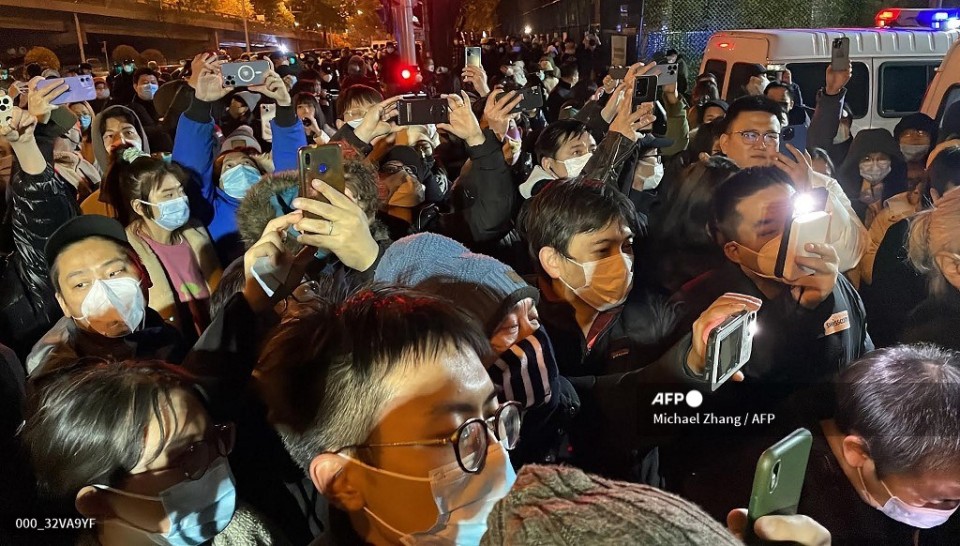 Protesters gather along a street during a rally for the victims of a deadly fire as well as a protest against China’s harsh Covid-19 restrictions in Beijing on November 28, 2022. – A deadly fire on November 24, 2022 in Urumqi, the capital of northwest China’s Xinjiang region, has become a fresh catalyst for public anger, with many blaming Covid lockdowns for hampering rescue efforts, as hundreds of people took to the streets in China’s major cities on November 27, 2022 to protest against the country’s zero-Covid policy in a rare outpouring of public anger against the state. Authorities deny the claims. (Photo by Michael Zhang / AFP)
