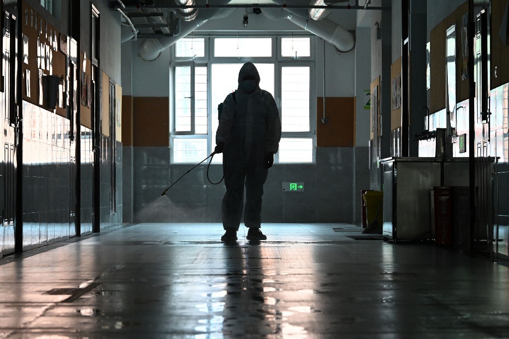 A staff member sprays disinfectant in a corridor at a school ahead of the new semester in Handan in China’s northern Hebei province on August 29, 2022. (Photo by AFP) / China OUT