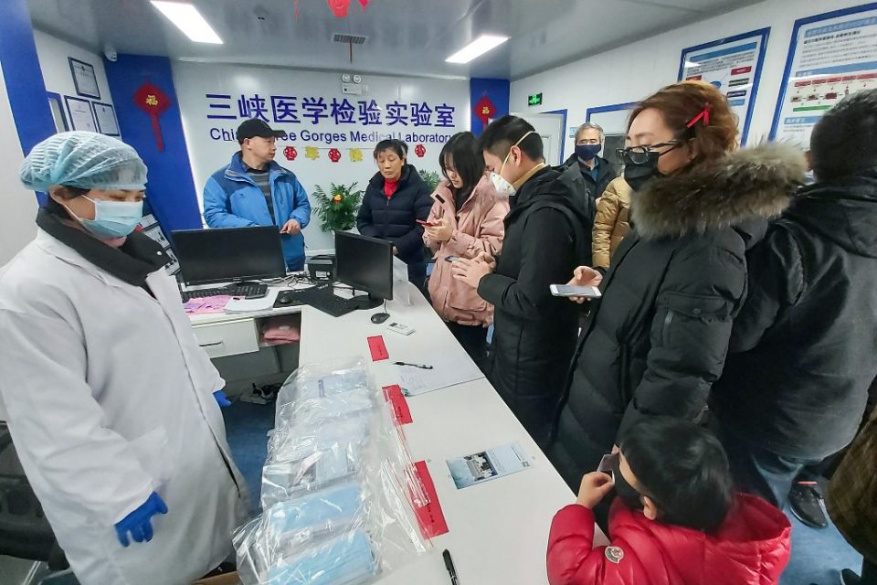 This photo taken on January 22, 2020 shows staff members of the Three Gorges Medical Laboratory offering free masks to the public in Yichang in China’s central Hubei province. – China banned trains and planes from leaving Wuhan at the centre of a virus outbreak on January 23, seeking to seal off its 11 million people to contain the contagious disease that has claimed 17 lives, infected hundreds and spread to other countries. (Photo by STR / AFP) / China OUT