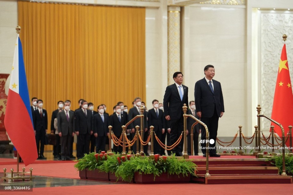 This handout photograph released by the Philippine’s Office of the Press Secretary and taken on January 4, 2023 shows China’s President Xi Jinping (R) and Philippine President Ferdinand Marcos Jr (L) during a welcome ceremony at the Great Hall of People in Beijing. (Photo by Handout / Philippines’s Office of the Press Secretary / AFP)