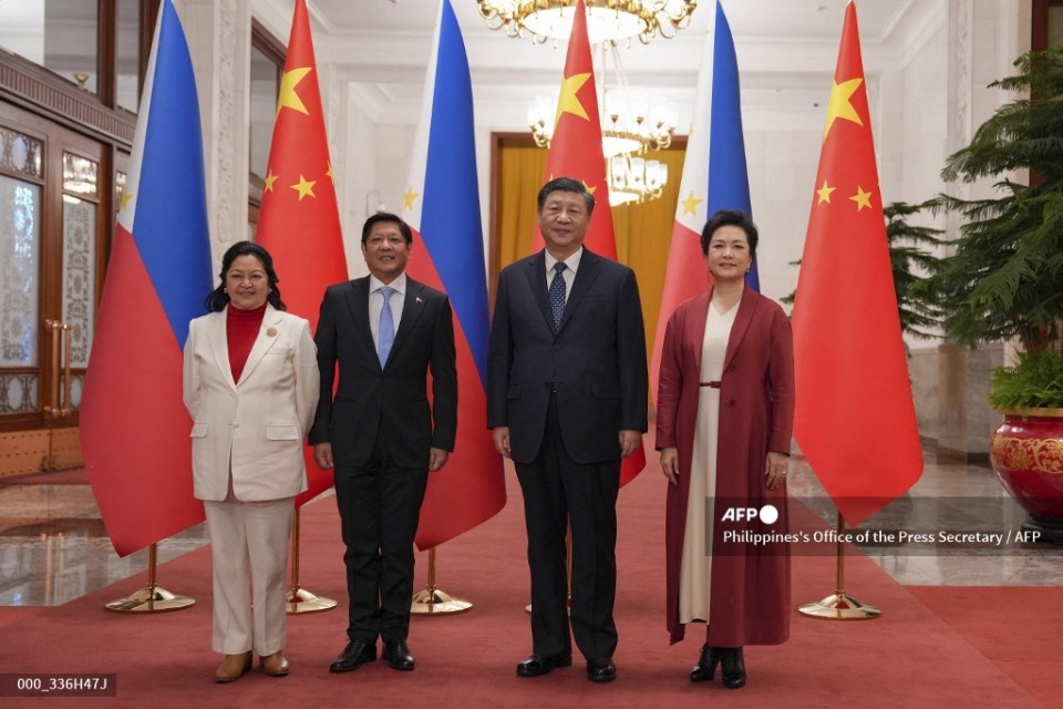 This handout photograph released by Philippine’s Office of the Press Secretary and taken on January 4, 2023, shows (from L) Philippine’s First lady Liza Araneta Marcos, Philippine’s President Ferdinand Marcos Jr, China’s President Xi Jinping and Peng Li Yuan, wife of President Xi, posing for a photo during a welcome ceremony at the Great Hall of People in Beijing. (Photo by Philippines’s Office of the Press Secretary / AFP)