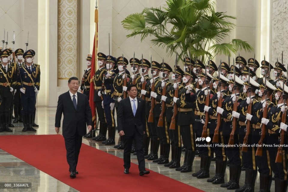 This handout photograph released by the Philippine’s Office of the Press Secretary and taken on January 4, 2023 shows China’s President Xi Jinping (L) and Philippine President Ferdinand Marcos Jr reviewing an honour guard during a welcome ceremony at the Great Hall of People in Beijing. (Photo by Handout / Philippines’s Office of the Press Secretary / AFP)
