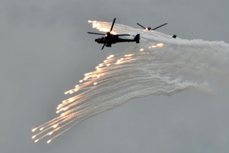 Two US-made AH-64E Apache attack helicopters release flares during Taiwan’s annual Han Kuang military drills July 2020 (AFP photo)