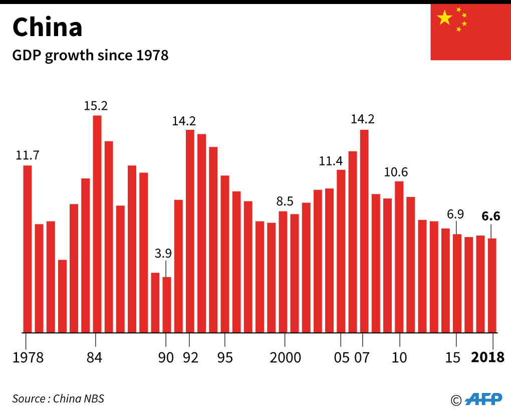 BEIJING, China (AFP) — China’s economy grew at its slowest pace in almost three decades in 2018, losing more steam in the last quarter as it battles a massive debt pile and a US trade war, official data showed Monday.