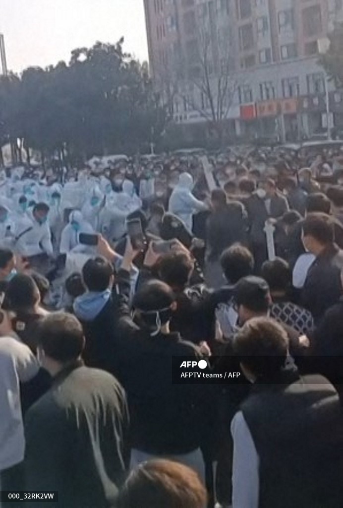 One worker told AFP the protests had begun over a dispute over promised bonuses at the locked-down factory, run by Taiwanese tech-giant Foxconn.