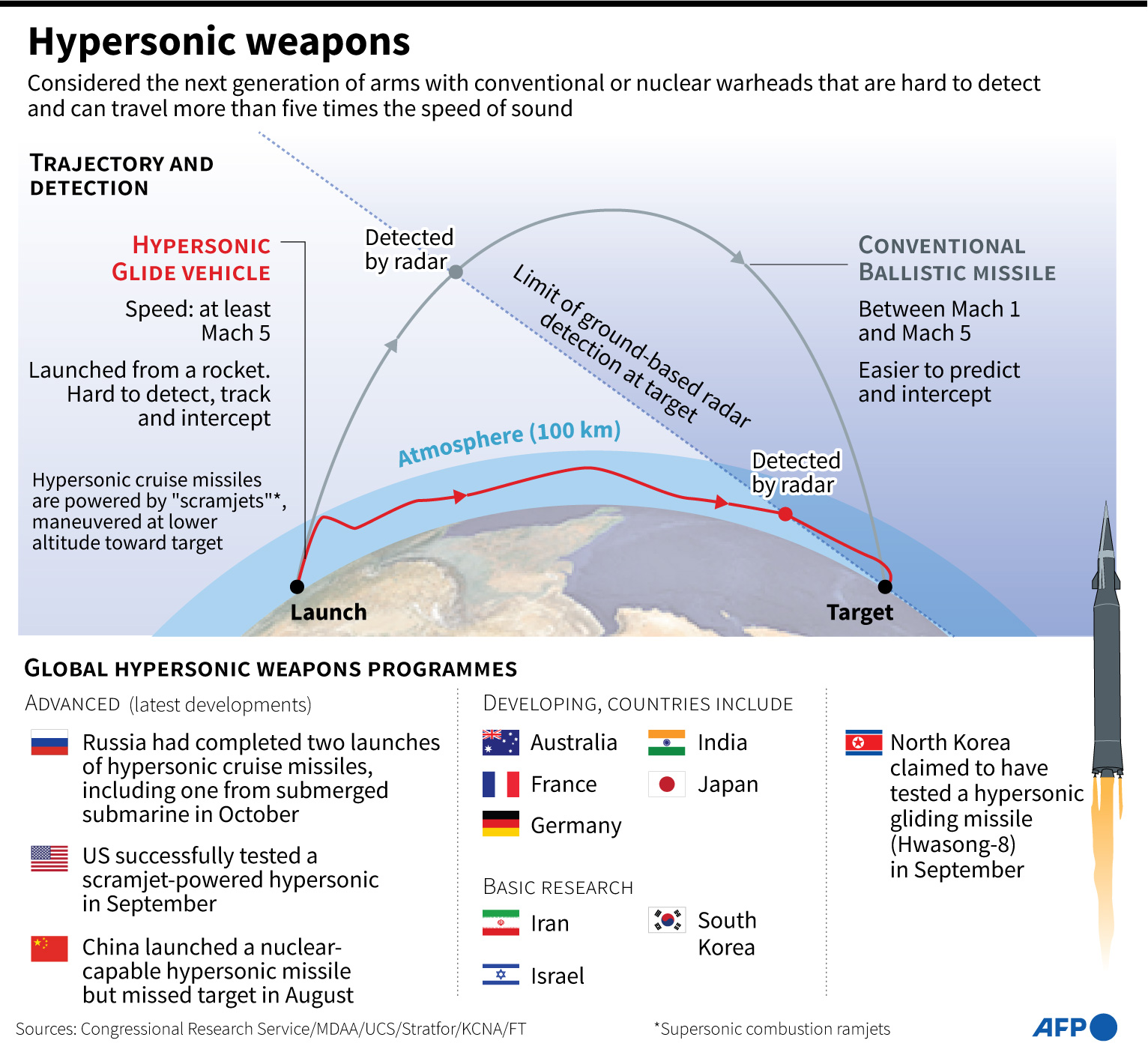 WASHINGTON, United States (AFP) — China’s test of a globe-circling hypersonic weapon in July included the unprecedented launch of a separate missile from the ultra-high-speed vehicle, according to the Financial Times and Wall Street Journal.