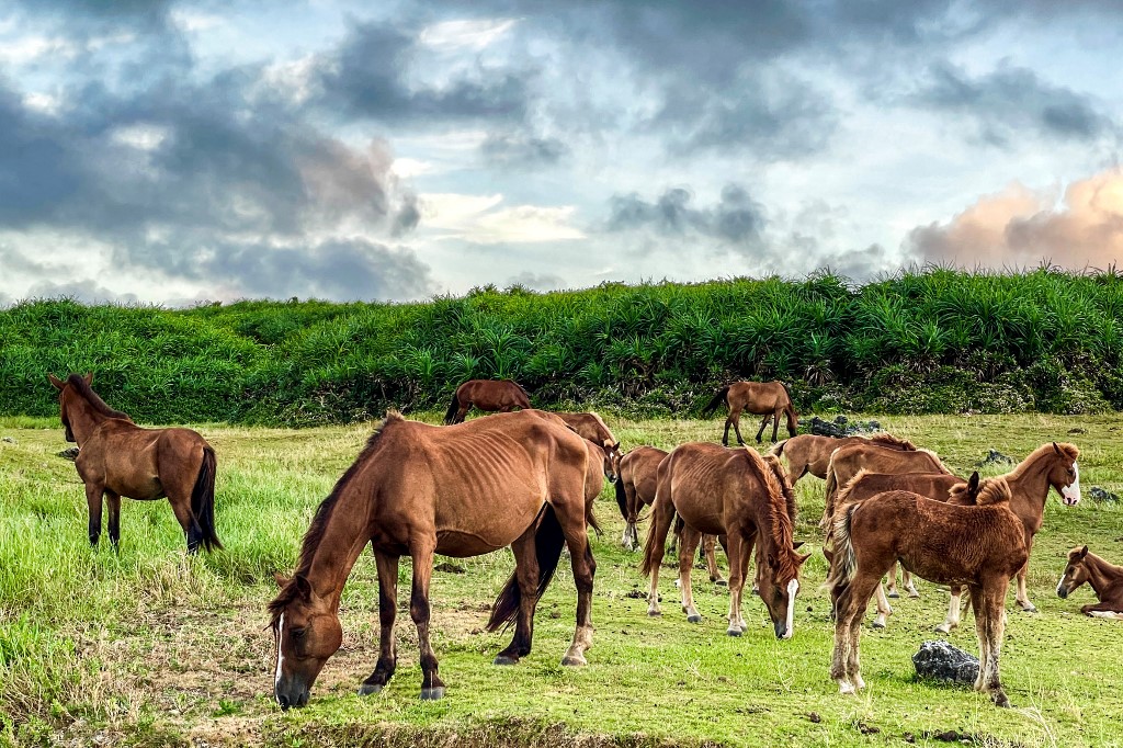 (FILES) This picture taken on August 18, 2022 shows wild horses grazing on a field on Yonaguni Island, Okinawa prefecture(Photo by Mathias CENA / AFP)