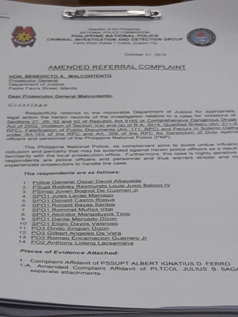 Albayalde, who was the provincial director when the raid took place, is specifically facing charges for violation of Section 92 of the Comprehensive Dangerous Drugs Act and the Anti-Graft law, qualified bribery, falsification of public documents, perjury in solemn oaths and dereliction of duty.