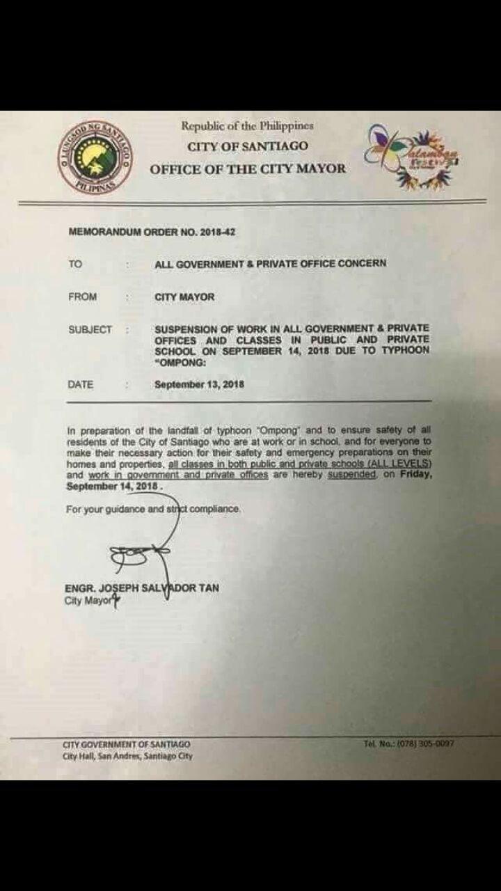 (Eagle News) – -The Santiago City government in Isabela has suspended government and private work on Friday, Sept. 14, as “Ompong” threatens parts of the country.