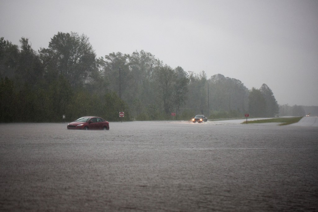 Floodwaters overtake US Route 17 and a caroutside of Jacksonville, North Carolina, on September 15, 2018, during Tropical Storm Florence. – The governor of North Carolina on Saturday warned residents displaced by a killer storm against returning home because of the dangers posed by rising floodwaters. “Know that water is rising fast everywhere, even in places that don’t typically flood,” said Governor Roy Cooper. “This system is unloading epic amounts of rainfall: in some places, measured in feet, not inches.” (Photo by Logan Cyrus / AFP)