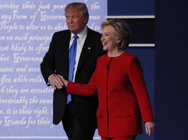 Clinton, 68, wore a red pantsuit, and Trump, 70, wore a dark suit and a blue tie to the encounter that could shift the course of the tight race for the Nov. 8 election. She called him Donald, and he called her Secretary Clinton.