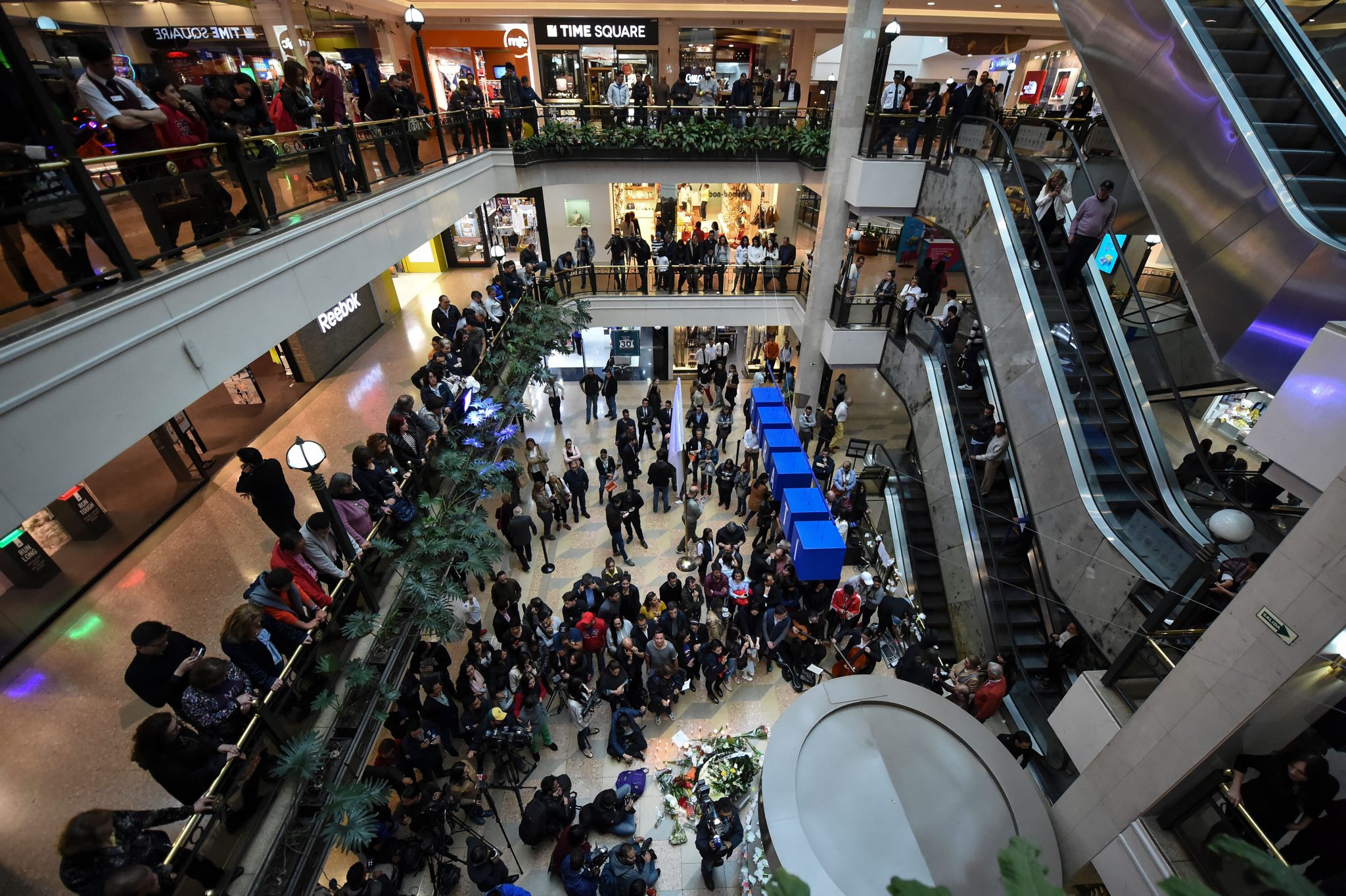 Dozens gathered at the mall Sunday to pay homage to the victims, jostling to leave flowers and candles at a makeshift memorial.