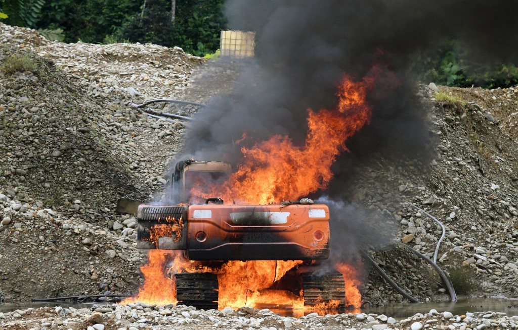 Their mission is to destroy bulldozers to prevent villagers from mining for gold, an illegal activity that helps fund the National Liberation Army (ELN) rebels and dissidents of the now-defunct Revolutionary Armed Forces of Colombia (FARC) guerrillas who made peace with the state in 2016, laying down their arms to form a communist political party.
