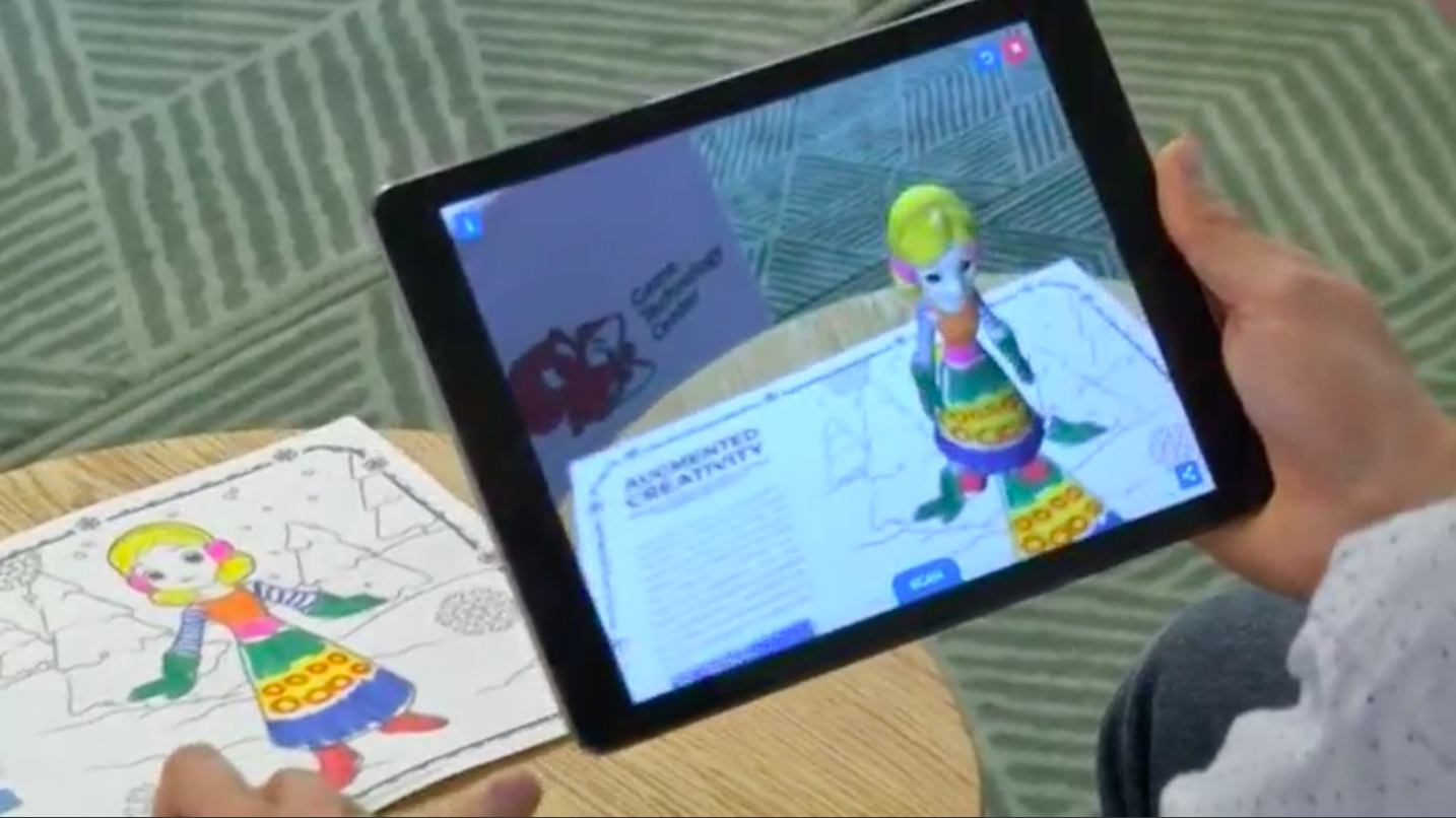 Children use pens or crayons to colour in a cartoon-like character, such as a princess or an octopus. When a tablet running their app is held over the finished picture the character bursts into life with the colours transferred to a three-dimensional, moving cartoon character.