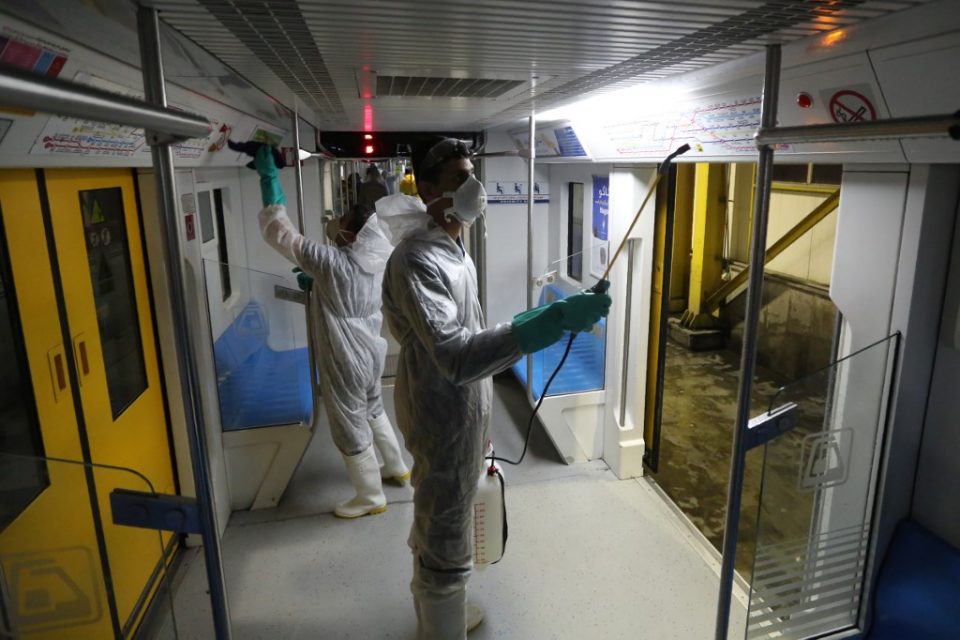 Tehran Municipality workers clean a metro train to avoid the spread of the COVID-19 illness on February 26, 2020. – Iran said Tuesday its coronavirus outbreak, the deadliest outside China, had claimed 15 lives and infected nearly 100 others — including the country’s deputy health minister. The Islamic republic’s neighbors have imposed travel restrictions and strict quarantine measures after reporting their first cases in recent days, mostly in people with links to Iran. (Photo by ATTA KENARE / AFP)