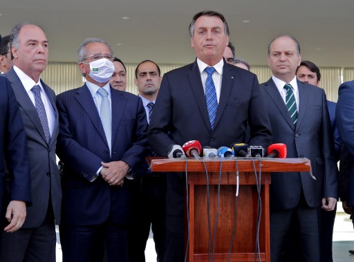 Brazilian President Jair Bolsonaro (C) speaks alongside Brazilian Economy Minister Paulo Guedes (L), deputies and senators during a statement on financial aid for vulnerable Brazilians amid the COVID-19 pandemic, at Planalto Palace, in Brasilia, on September 1, 2020. – Brazil announced a reduction of 9.1% in the gross domestic product. (Photo by Sergio Lima / AFP)
