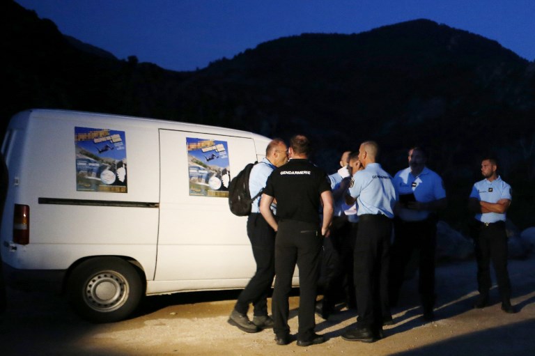 French Gendarmes stand next to a vehicle as they do searches at the canyon where four people died after a flood occurred due to bad weather conditions on August 1, 2018 close to the village of Soccia, on the French Mediterranean island of Corsica. / AFP Photo / Pascal Pochard-Casabianca