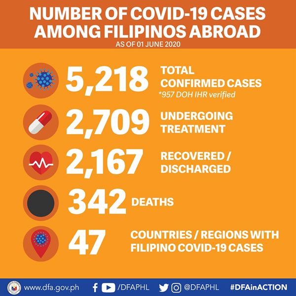 (Eagle News) – The Department of Foreign Affairs (DFA) reported 34 new confirmed COVID-19 cases involving overseas Filipinos, with the total number of confirmed cases now at 5,218 as of Monday, June 1.