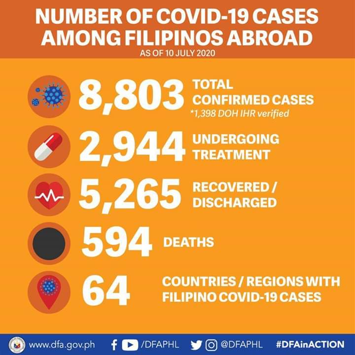 (Eagle News)–The number of coronavirus disease 2019 cases among overseas Filipinos has breached the 8000 mark, the Department of Foreign Affairs said on Friday, July 10.